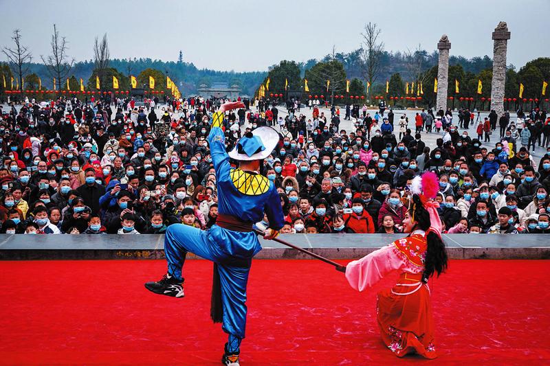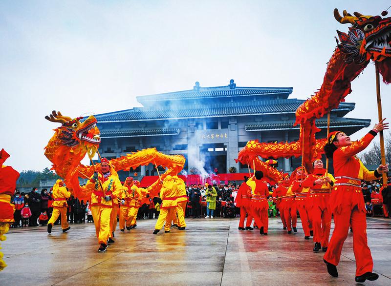 图1为两支舞龙队在炎帝故里景区谒祖广场进行民俗节目表演。(随州日报全媒记者李文军摄) 图2为炎帝故里景区谒祖广场花鼓戏戏曲联唱。(随州日报全媒记者李文军摄)