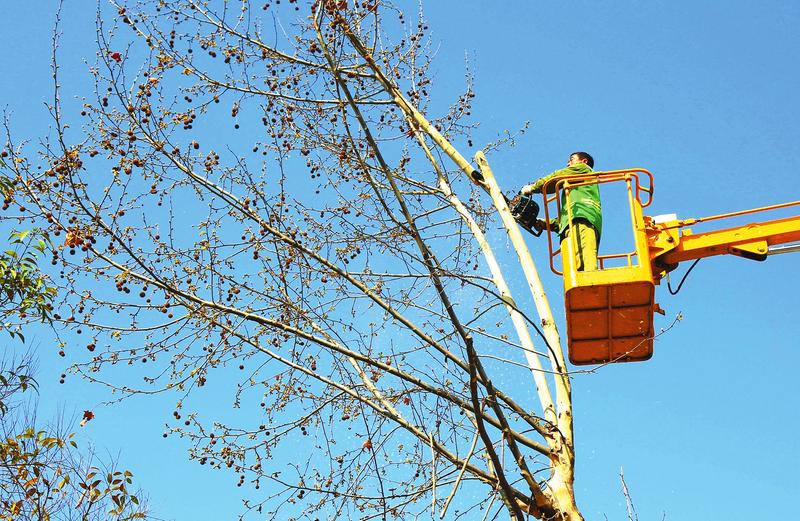 为切实解决好随州城区法桐飞絮扰民的问题,从3月22日开始,市城管执法委绿化管理处计划利用一周时间,对城区烈山大道道路西侧的170余株的法桐进行全面修剪。图为园林工人正在高空修剪作业。(随州日报通讯员聂少峰摄)