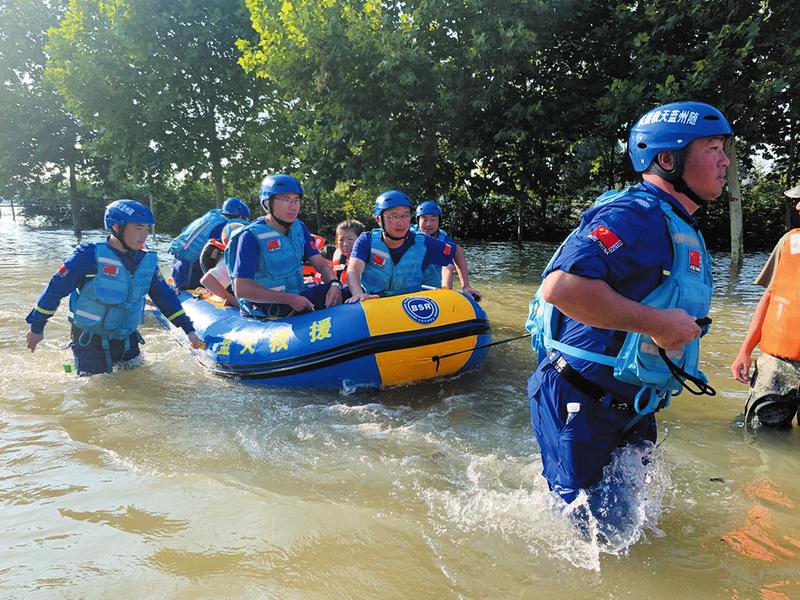 图为随州蓝天救援队在河南新乡市牧野区转移受灾群众。 7月24日8:30,随州蓝天救援队李长长、马勇军、张德义、朱银、王堒5人携冲锋舟和救援装备进入河南省新乡市牧野区曲韩社区执行救援任务。9:30,救援队到达现场,开始救援,共出动24艇次,转运被困人员196名,其中孕妇10人、儿童56人、重病号6人、老人47人。17:40,救援队接前指指示,撤出救援现场。另外,随州蓝天救援队第二梯队唐昭、张浩制、冯伟、王铖、肖旭5名队员7月23日晚上11点赶到新乡与先期到达的队员会合,一起参与救援。 |